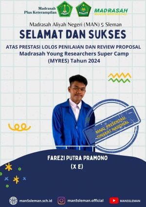 Sleman—(MAN 5 Sleman) Alhamdulillah, MAN 5 Sleman bersyukur dan bangga dengan raihan peneliti mudanya, Farezi Putra Pramono siswa kelas X E yang sudah berhasil melewati tahap review proposal penelitian pada ajang MYRES 2024.