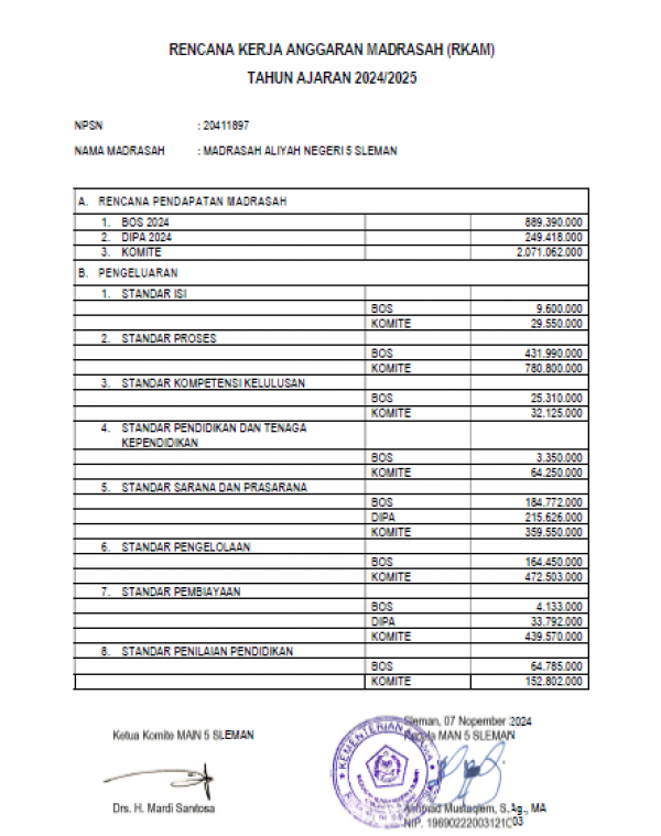 RENCANA KERJA ANGGARAN MADRASAH (R-KAM) MAN 5 SLEMAN TAHUN AJARAN 2024/2025