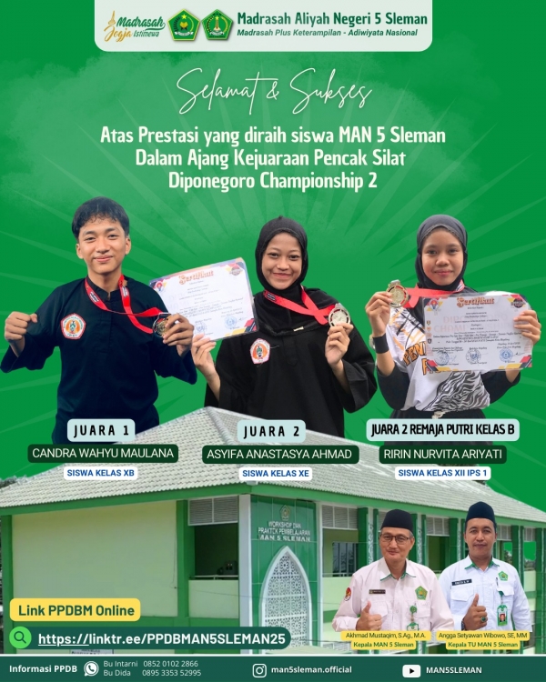 Sleman (MAN 5 Sleman) – Prestasi membanggakan kembali ditorehkan oleh siswa-siswi MAN 5 Sleman. Tiga atlet muda berbakat, Candra Wahyu Maulana dari kelas X B dan Asyifa Anastasya Ahmad dari kelas X E, dan ririrn Nurvita kelas XII IPS 1 berhasil meraih juara dalam ajang bergengsi Kejuaraan Nasional Pencak Silat Diponegoro Championship 2 yang diselenggarakan di GOR Samapta, Kota Magelang, Jawa Tengah, pada Sabtu, 19 April 2025.