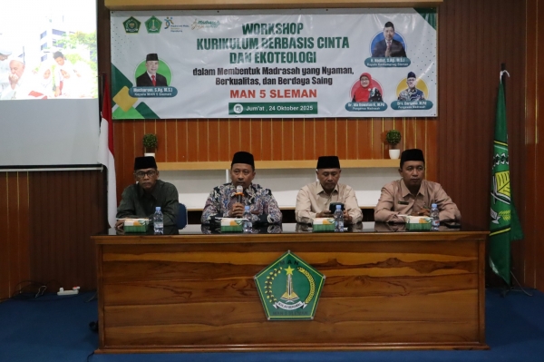 MAN 5 Sleman menggelar Workshop Kurikulum Berbasis Cinta dan Ekoteologi pada Jumat, 24 Oktober 2025, bertempat di ruang AVA madrasah. Kegiatan ini menghadirkan tiga narasumber tingkat kabupaten yang kompeten di bidangnya. Workshop ini bertujuan memperkuat pemahaman guru dalam mengimplementasikan kurikulum yang tidak hanya berorientasi akademik, tetapi juga menyentuh aspek spiritual, emosional, dan ekologis sebagai bentuk respon pendidikan terhadap tantangan era modern menuju Indonesia Emas 2045.