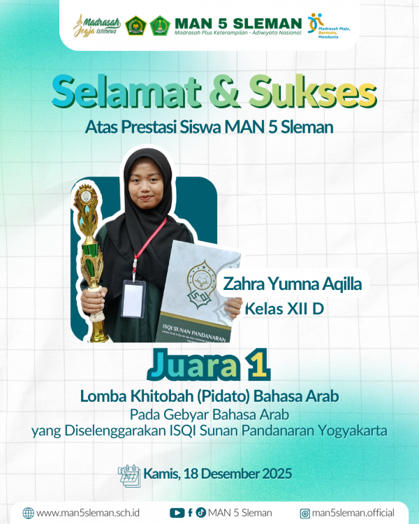 MAN 5 Sleman kembali menorehkan prestasi membanggakan di penghujung tahun 2025. Zahra Yumna Aqilla, siswi kelas XII D, berhasil meraih Juara 1 Lomba Khitobah (Pidato Bahasa Arab) yang diselenggarakan oleh ISQI Sunan Pandanaran Yogyakarta pada tanggal 18 Desember 2025. Prestasi ini menjadi bukti kesungguhan siswa serta hasil pembinaan yang intensif dari madrasah, khususnya dalam bidang penguatan kemampuan Bahasa Arab.