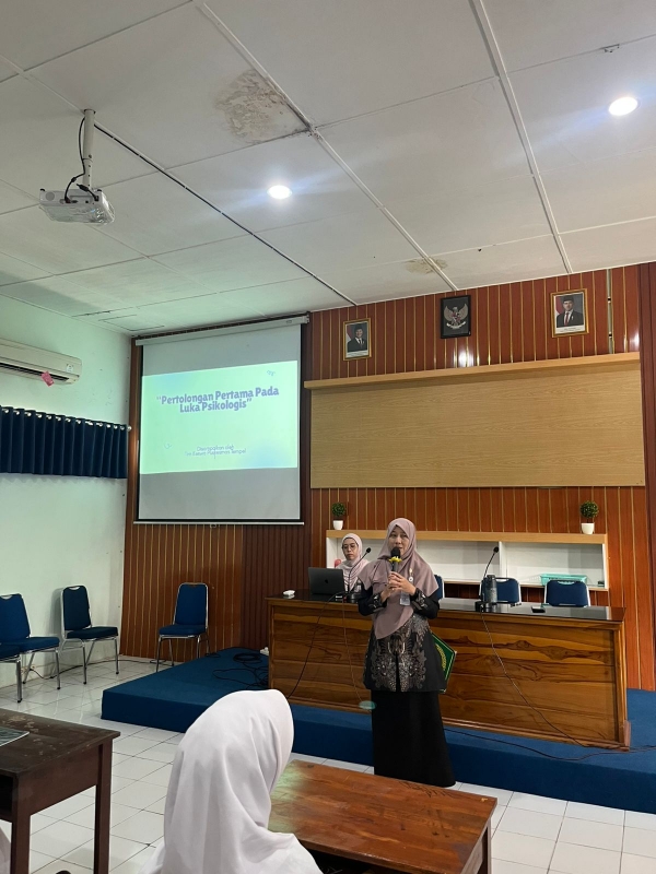 Kegiatan berlangsung dengan lancar dan penuh antusiasme. Bertindak sebagai narasumber, Ibu Sasriyanti, M.Psi dari Puskesmas Tempel I menyampaikan materi mengenai pentingnya pertolongan pertama pada luka psikologis. Dalam pemaparannya, ia menekankan tiga langkah utama dalam memberikan bantuan awal, yaitu memperhatikan, mendengarkan, dan mengamankan.