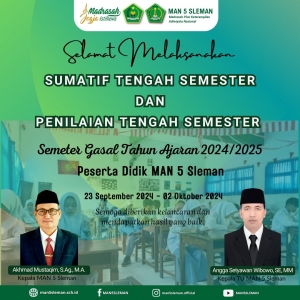 Sleman (MAN 5 SLEMAN), (30/9/2024) – MAN 5 Sleman resmi melaksanakan Penilaian Tengah Semester (PTS) atau Sumatif Tengah Semester (STS) untuk Tahun Ajaran 2024/2025 yang berlangsung mulai 23 September hingga 3 Oktober 2024.