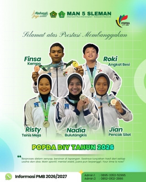 SLEMAN – Keluarga besar MAN 5 Sleman kembali diselimuti rasa bangga menyusul keberhasilan lima atlet terbaiknya meraih medali dalam ajang Pekan Olahraga Pelajar Daerah (POPDA) tingkat Daerah Istimewa Yogyakarta 2026.