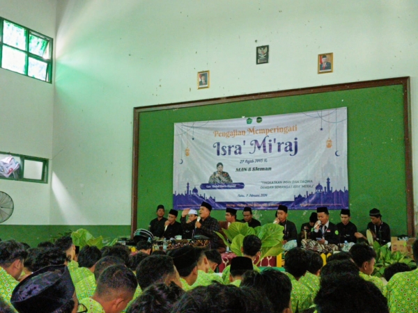 Sleman (MAN 5 Sleman) Sebagai wujud moderasi beragama, Madrasah Aliyah Negeri (MAN) 5 Sleman menggelar acara pengajian Isra' Mi'raj Nabi Muhammad SAW dengan tema "Tingkatkan Iman dan Takwa dengan Semangat Isra' Mi'raj". Acara yang diadakan pada Rabu, 07 Februari 2024, mulai pukul 08.30 hingga 11.30 WIB, berlangsung meriah di aula dan mushola MAN 5 Sleman.