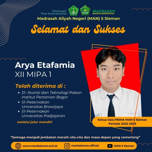 "Terima kasih saya sampaikan kepada kedua orang tua dan para guru MAN 5 Sleman yang terus memberikan bimbingan dan motivasinya sehingga saya berhasil diterima di PTN Favorit saya," tambahnya. Untuk PTN yang dipilih Arya kedepan rencananya ia mau memantapkan memilih ITB karena pertimbangan jarak dari rumah.