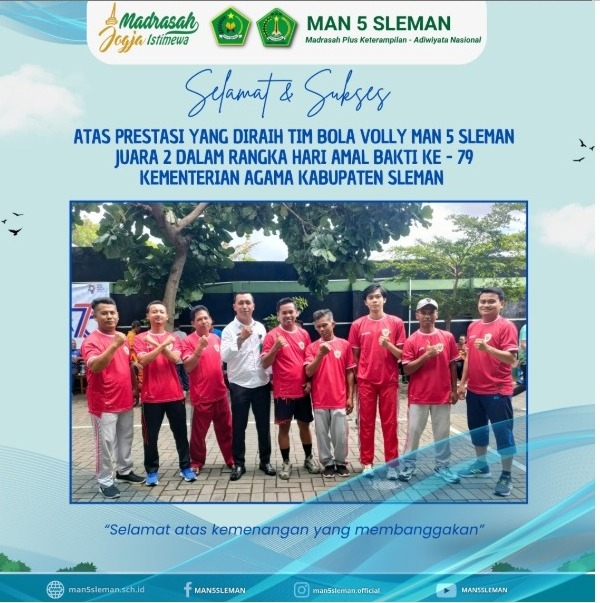 Tim bola voli MAN 5 Sleman terdiri dari tujuh guru yang turut bertanding dengan penuh semangat dan sportivitas, yaitu Bapak Bibit, Bapak Latif, Bapak Wahir, Bapak Harun, Bapak Giyanto, Bapak Ratijo, dan Bapak Isnan. Dengan persiapan matang dan kerja sama yang solid, mereka berhasil menunjukkan kemampuan terbaiknya dan membawa pulang gelar Juara 2.