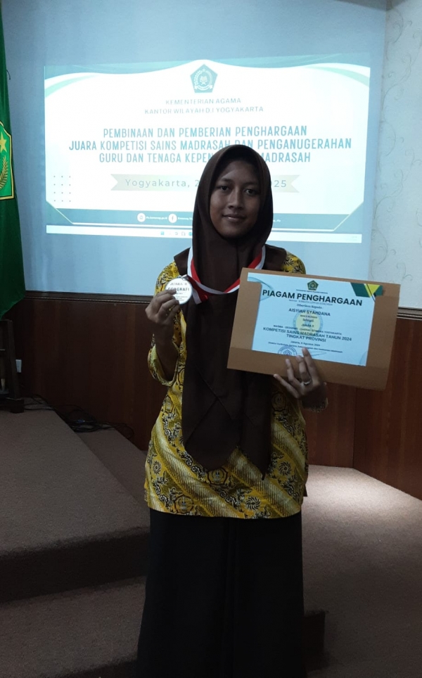 Kakanwil Kemenag DIY, Ahmad Bahiej, secara langsung menyerahkan medali dan sertifikat kepada Aisyah sebagai bentuk apresiasi atas prestasinya. Turut hadir dalam acara tersebut Kepala MAN 5 Sleman, Akhmad Mustaqim, S.Ag., MA, yang mengucapkan selamat kepada Aisyah atas keberhasilannya. Beliau juga menyampaikan rasa terima kasih kepada para pembimbing KSM MAN 5 Sleman, Minda Herlina, S.Pd., dan Dharu Dwi Oktavian, S.Pd., M.Pd, yang telah dengan sabar membimbing siswa dalam mempersiapkan kompetisi.