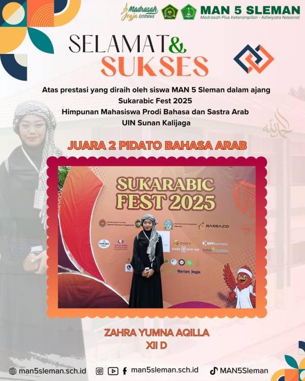 Sleman (MAN 5 Sleman) – Prestasi gemilang kembali diraih MAN 5 Sleman. Zahra Yumna Aqilla, siswi kelas XII D, berhasil meraih Juara 2 dalam lomba khitobah atau pidato bahasa Arab tingkat pelajar pada Sukarabic Fest VIII yang diselenggarakan oleh Himpunan Mahasiswa Program Studi Bahasa dan Sastra Arab UIN Sunan Kalijaga.