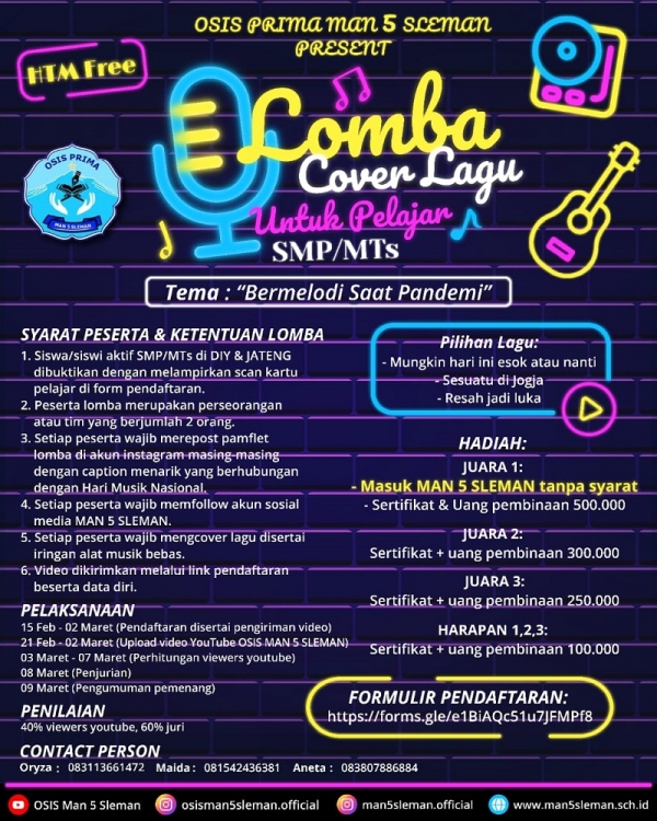 Syarat peserta dan ketentuan lomba yaitu siswa-siswi SMP/MTs di DIY dan Jawa Tengah dengan dibuktikan melampirkan scan Kartu Pelajar di form pendaftaran, peserta lomba merupakan perseorangan atau tim yang berjumlah 2 orang, setiap peserta wajib merepost pamflet lomba di akun Istagram masing-masing dengan caption menarik yang berhubungan dengan Hari Musik Nasional, setiap peserta wajib menfollow akun sosial media MAN 5 Sleman, setiap peserta wajib mengcover lagu disertai iringan alat musik bebas, dan video dikirimkan melalui link pendaftaran beserta data diri