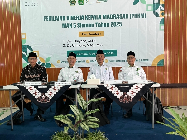 MAN 5 Sleman melaksanakan kegiatan Penilaian Kinerja Kepala Madrasah (PKKM) sebagai bagian dari upaya peningkatan mutu tata kelola dan kepemimpinan madrasah. Kegiatan ini diikuti oleh Kepala MAN 5 Sleman, Mucharom, S.Ag., M.S.I., dan berlangsung dengan penuh khidmat serta profesional.