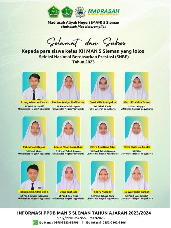 Sleman (MAN 5 Sleman)—Sebanyak 12 Siswa Madrasah Aliyah Negeri (MAN) 5 Sleman berhasil lolos Seleksi Nasional Berdasarkan Prestasi (SNBP) 2023 di beberapa PTN favorit di Yogyakarta. Pengumuman SNBP di umumkan Selasa (28/03/2023) mulai pukul 15.00 WIB melalui website resmi https://pengumuman-snbp-snpmb.bppp.kemdikbud.go.id/ dengan menggunakan nomer registrasi dan tanggal lahir siswa.