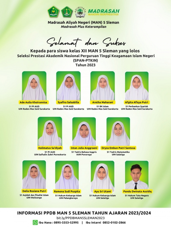 Sleman (MAN 5 Sleman)—Sebanyak 11 Siswa Madrasah Aliyah Negeri (MAN) 5 Sleman berhasil lolos Seleksi Prestasi Akademik Nasional Perguruan Tinggi Keagamaan Islam Negeri (SPAN-PTKIN). Pengumuman SPAN PTKIN di umumkan Senin (03/04/2023) mulai pukul 10.00 WIB melalui website resmi https://pengumuman-span.ptkin.ac.id/page  dengan memasukkan NISN peserta.